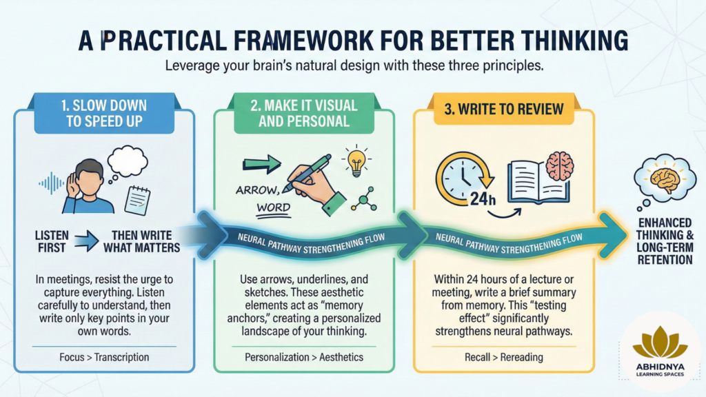 - Slow Down to Speed Up: In meetings, resist the urge to capture everything. Listen first, then write only what matters in your own words.