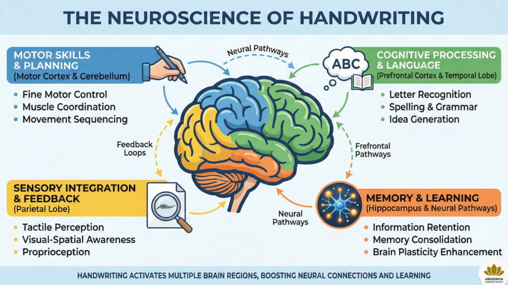 - The Motor Cortex: Controls the precise, unique flowing gestures required to construct each letter.